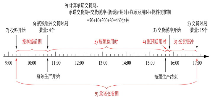 承诺交货期=交货缓冲+瓶颈后用时+瓶颈总用时+投料提前期